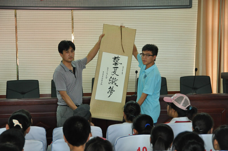 實踐團組織夏令營學生召開了“新生見面會”,加深了實踐團與中學生的認識與了解,介紹了夏令營期間即將開展的各項活動。藝傳學院李大壯同學代表實踐分團將其書法作品藝夏織夢贈予石窩中學,表達了實踐分團與石窩中學友好合作,共度美好夢想之夏的愿望。