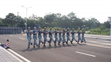 下午,在同學們拍照留念后,繼續進行了緊張的訓練。軍訓已經過半,訓練有了明確的部署與分配:行進式、警盾操、軍體拳等,其中最主要的是方陣訓練。從方陣的隊形、步伐、姿勢以及聲音等方面可以折射出參訓同學的努力程度以及吃苦耐勞的精神。