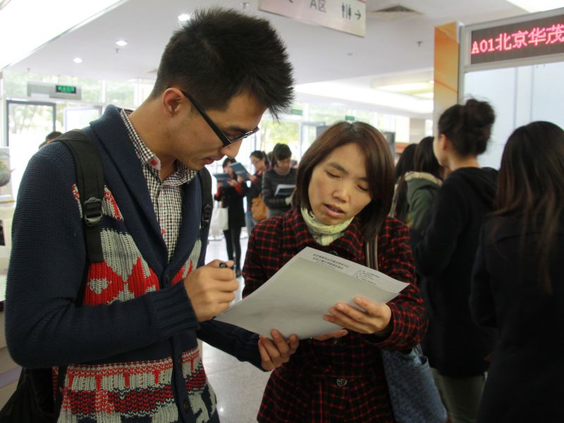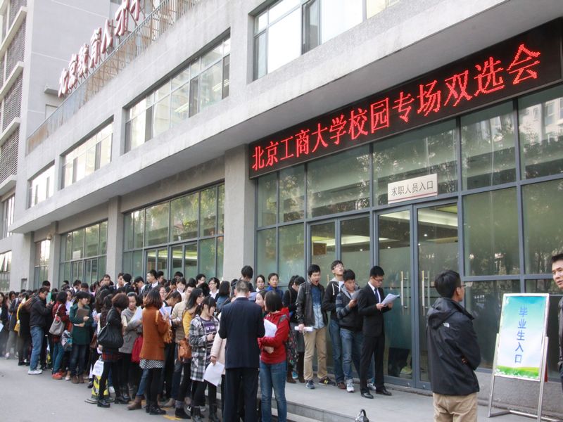 畢業(yè)生積極響應(yīng),單場參會人數(shù)達(dá)2千余人。開場不久后,部分用人單位展臺已被學(xué)生圍得水泄不通,國企、事業(yè)單位、有解決戶口能力的單位仍然是畢業(yè)生們的重點關(guān)注對象。其中,北京環(huán)球國廣商貿(mào)有限公司張貼出“公司擇優(yōu)解決北京戶口”告示,使得該企業(yè)成為眾多外地求職學(xué)生應(yīng)聘的首選對象。