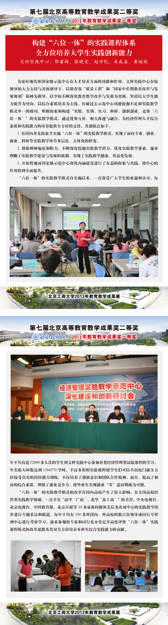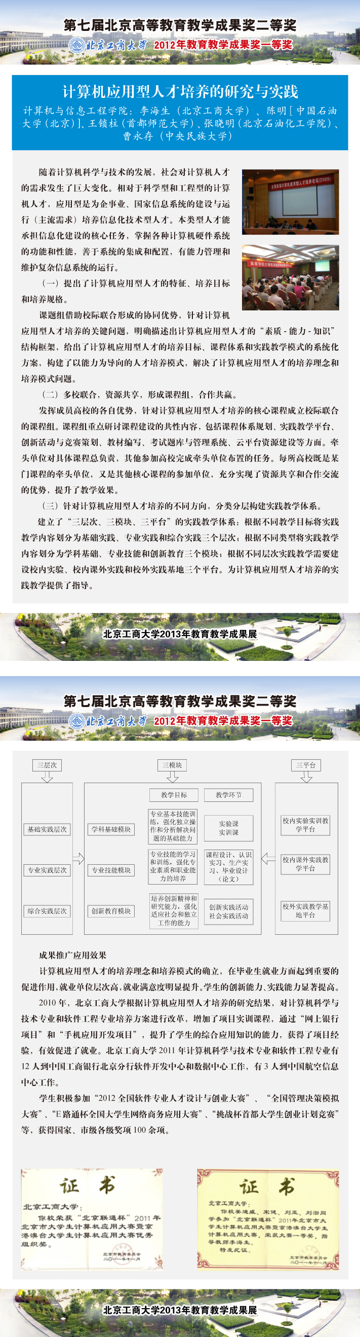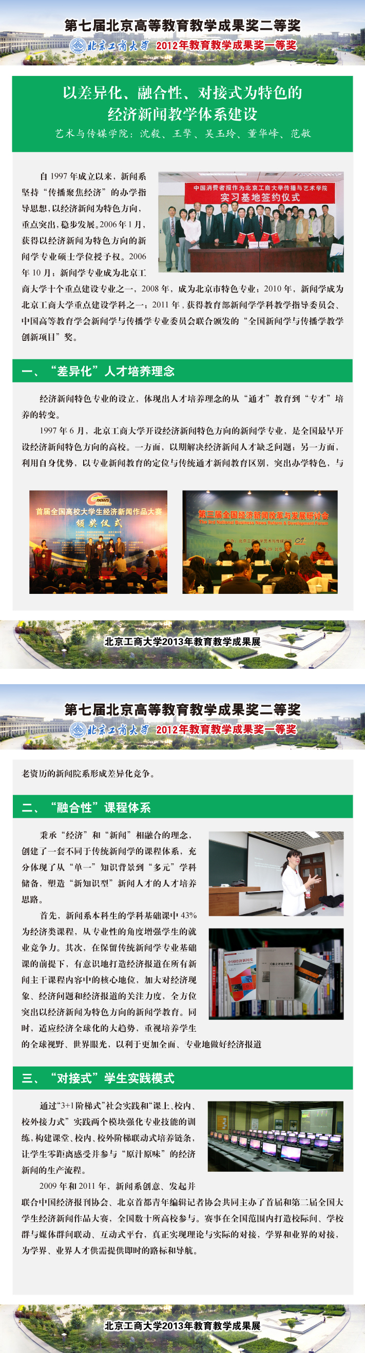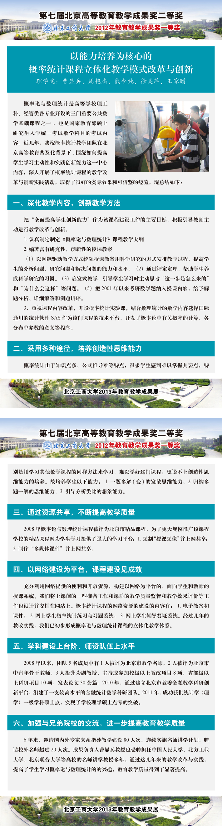 日前,《北京市教育委員會、北京市人力資源和社會保障局、北京市財政局關于表彰北京市教育教學成果獎的決定》(京教人〔2013〕18號)發(fā)布。在第七屆北京市高等教育教學成果獎評選活動中,我校共有5項成果榮獲一等獎、9項成果榮獲二等獎。根據北京市教委有關文件精神,為了更好地展示和宣傳我校教育教學和人才培養(yǎng)成果,總結本科教育教學經驗,營造良好的教學工作氛圍,學校舉辦2013年教育教學成果展,現(xiàn)進行網上展示。