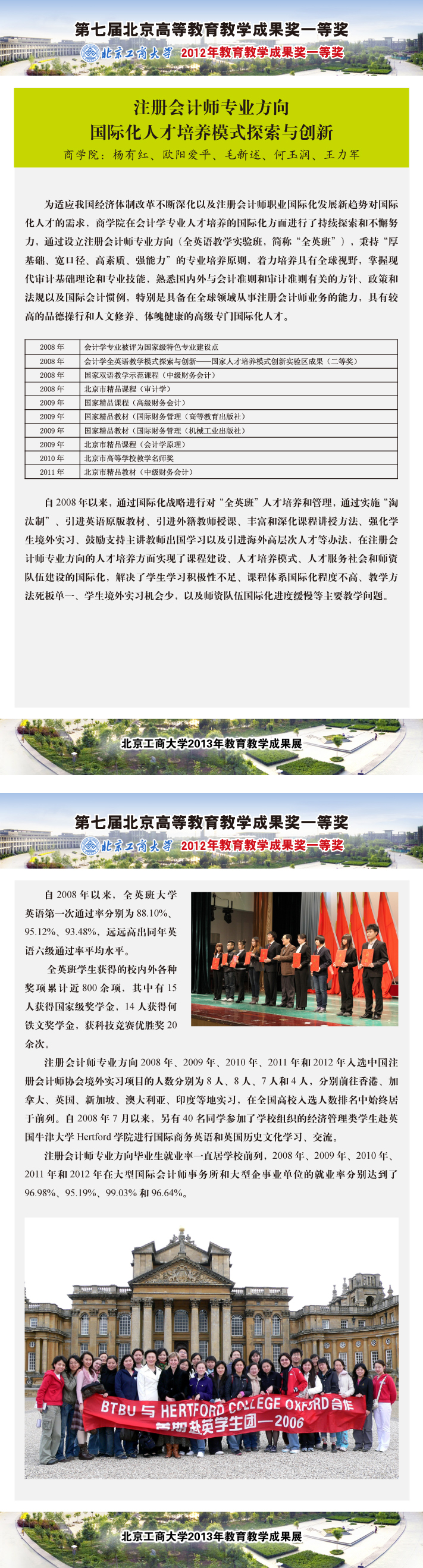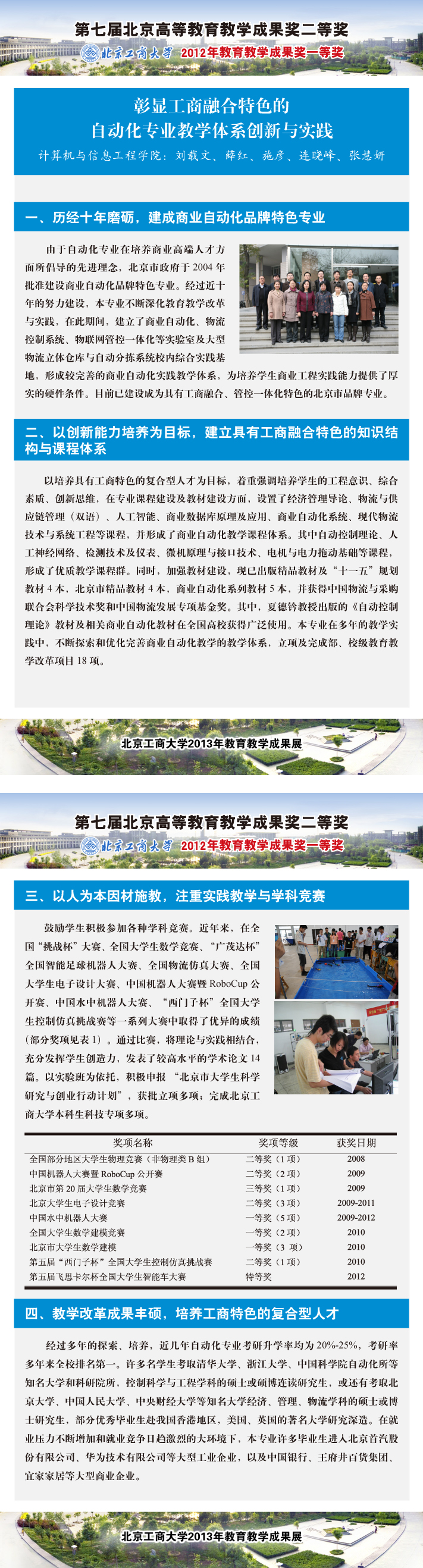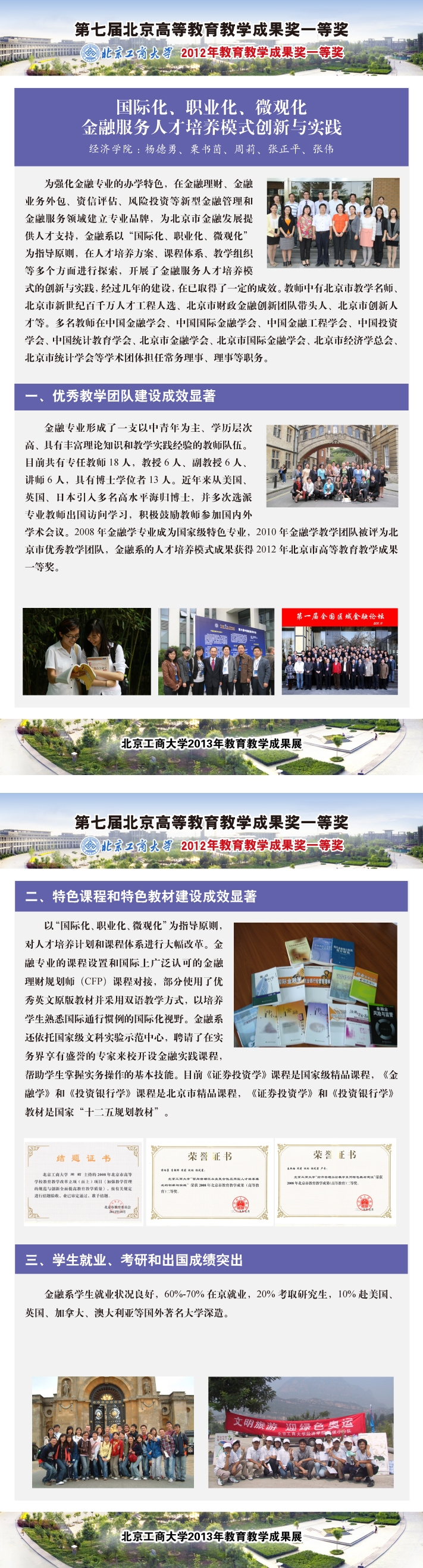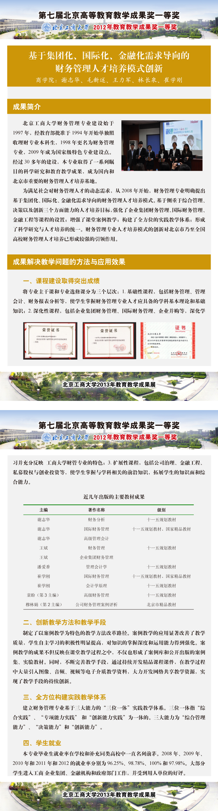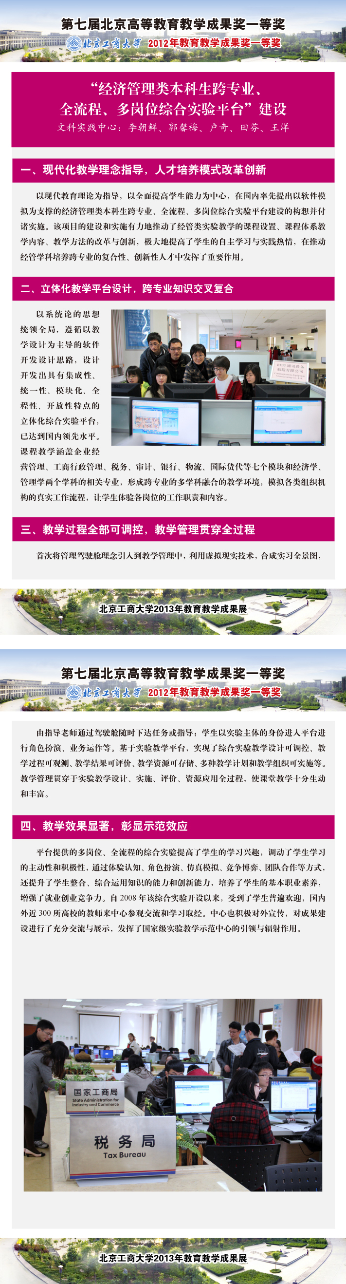 日前,《北京市教育委員會、北京市人力資源和社會保障局、北京市財政局關于表彰北京市教育教學成果獎的決定》(京教人〔2013〕18號)發(fā)布。在第七屆北京市高等教育教學成果獎評選活動中,我校共有5項成果榮獲一等獎、9項成果榮獲二等獎。根據北京市教委有關文件精神,為了更好地展示和宣傳我校教育教學和人才培養(yǎng)成果,總結本科教育教學經驗,營造良好的教學工作氛圍,學校舉辦2013年教育教學成果展,現(xiàn)進行網上展示。