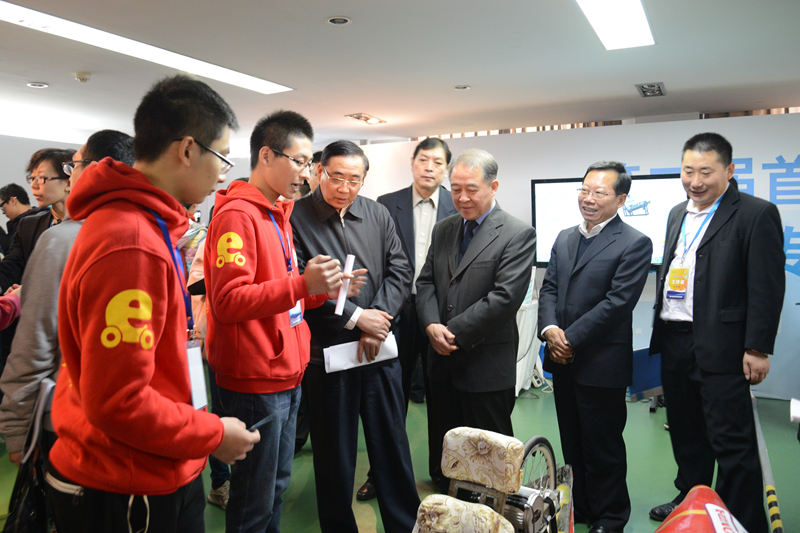 開幕儀式結束后,參會嘉賓觀看了科技創(chuàng)作品與專利成果展覽,并圍繞產(chǎn)品成本、創(chuàng)新點、實用性等和同學們親切交流。在我校展臺,周立軍副主席深入了解了我校“摳門狼”節(jié)能車隊的產(chǎn)品,希望學生們繼續(xù)鉆研核心技術,從使用對象等多方面進行考慮,使技術更加精尖,從而更加專業(yè)化。
