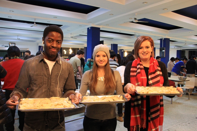 12月10日,國際處組織留學生與國際交流與合作協會的志愿者在東區食堂開展了“中國傳統文化之冬至包餃子活動”。中外學生早早地來到食堂,一看到擺放整齊的搟面杖、面團、餃子餡就迫不及待地行動起來。對于從未包過餃子的外國留學生來說,包餃子是一項比較困難的技術活。在志愿者的耐心幫助下,每一個留學生都學會了搟皮,包出了自己滿意的餃子。經過將近1個半小時的努力,大家一同品嘗了親手包的熱氣騰騰的餃子。留學生們紛紛表示,這是他們吃過最好吃的餃子。