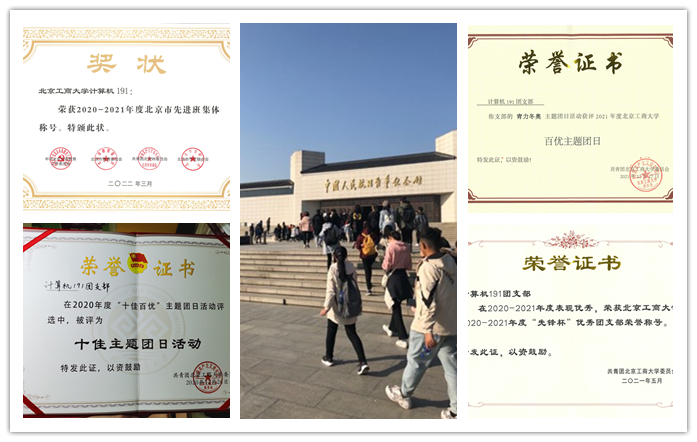 計算191班定期召開團日活動,加強團支部建設,先后召開了70華誕國威揚、建黨百年、學習二十大精神等主題團日活動。在區域化團建中,班級曾先后前往軍事博物館、中國人民抗日戰爭紀念館參觀學習,將先進思想注入到全體同學心中。在五四青年節,團支部進行“五四精神,傳承有我”主題團日活動,并在微博超話中分享,彰顯共青團員良好的精神風貌。班級籌建了北工商計算機19級公眾號,在疫情期間組織同學們錄制視頻分享居家的學習和生活情況,以加強同學們之間的溝通與交流。在學校黨團班一體化的引領下,班級堅持以黨建帶團建、以團建帶班建,現有黨員11名,入黨積極分子19名,占全班總人數的79%。三年間,班級榮獲北京市先進班集體、“先鋒杯”團支部、百優團日活動等榮譽獎項。