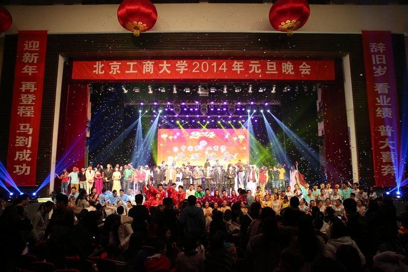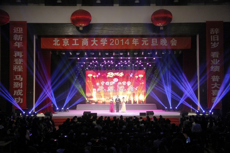 張燈結彩,工商校園一片快樂祥和;辭舊迎新,1314我們一起走過。書寫著“辭舊歲看業績普大喜奔,迎新年再登程馬到成功”的對聯懸掛在舞臺兩旁,4個大紅燈籠高高掛起,節日的文體館充滿著喜慶的氛圍。12月31日晚, “中國夢·工商情” 學校2014年元旦晚會在良鄉校區文體館精彩上演。