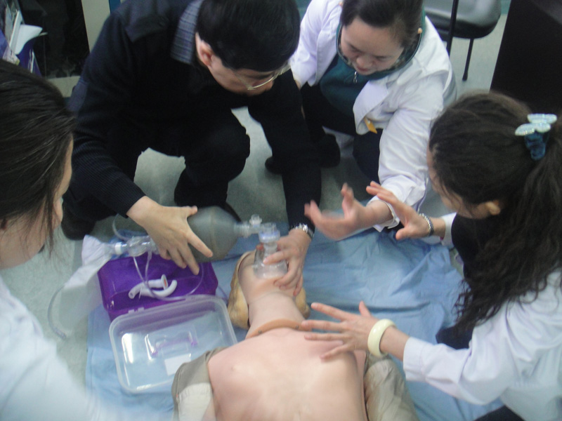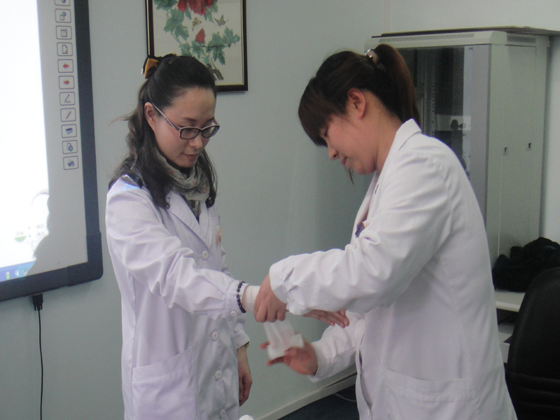 王立秋主任結(jié)合實(shí)際病例講述了急診急救的重要性、必要性和操作方法,通過播放視頻與現(xiàn)場示范,重點(diǎn)講述了心肺復(fù)蘇技術(shù)(2010版指南)、氣道管理的方法。結(jié)合高校實(shí)際情況,王主任有針對性地講解了常見外傷的止血、包扎等實(shí)用知識。蔡冶副院長及參訓(xùn)醫(yī)生就校醫(yī)院現(xiàn)有急救設(shè)備的充分利用與王主任進(jìn)行了交流。