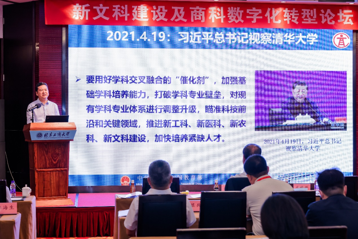 8月28日,新文科建設(shè)及商科數(shù)字化轉(zhuǎn)型論壇于線上線下同步舉行。本次論壇是在教育部、市教委相關(guān)領(lǐng)導(dǎo)的關(guān)心支持下,在中國(guó)人工智能學(xué)會(huì)、中國(guó)教育技術(shù)協(xié)會(huì)的具體指導(dǎo)下,由北京工商大學(xué)主辦,北京工商大學(xué)數(shù)字未來中心、相關(guān)學(xué)院和中國(guó)人工智能學(xué)會(huì)智能服務(wù)專委會(huì)承辦。論壇旨在順應(yīng)數(shù)字經(jīng)濟(jì)發(fā)展趨勢(shì),加快商科數(shù)字化轉(zhuǎn)型,認(rèn)真落實(shí)教育部、北京市對(duì)我校辦學(xué)的各項(xiàng)要求,以新文科建設(shè)和高等教育數(shù)字化轉(zhuǎn)型為主題開展學(xué)術(shù)研討。論壇開幕式由我校黨委書記黃先開主持。