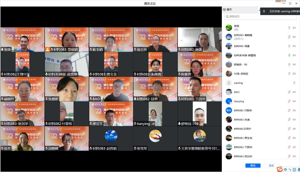 化學(xué)與材料工程學(xué)院召開材料科學(xué)與工程系校友交流會(huì),邀請(qǐng)校友相聚云端。呂東燕、學(xué)院領(lǐng)導(dǎo)、教師代表等44人參加會(huì)議。材料系主任張揚(yáng)教授介紹了該系的發(fā)展建設(shè)成果,校友們?cè)谥鹨唤榻B后,圍繞著母校和學(xué)院教學(xué)、科研、育人等熱點(diǎn)話題展開了討論,建言獻(xiàn)策,助力學(xué)校、學(xué)院發(fā)展。