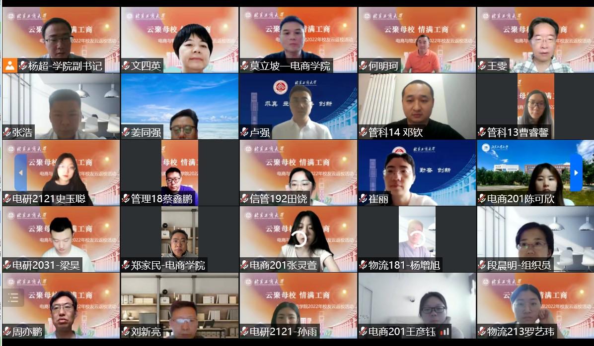 電商與物流學(xué)院開展了以“云聚母校,情滿工商”為主題的校友“云返校”活動(dòng),電子商務(wù)、物流管理、信息管理與信息系統(tǒng)、工業(yè)管理工程、倉(cāng)儲(chǔ)運(yùn)輸、經(jīng)濟(jì)信息管理和管理科學(xué)與工程專業(yè)校友齊聚云端,共同觀看學(xué)校宣傳片,一同唱響校歌,重溫青春歲月,暢聊深厚情誼。左敏出席會(huì)議,何明珂等教師代表、校友代表,學(xué)院領(lǐng)導(dǎo)班子、青年教師代表及在校生代表等近200人參加活動(dòng)。