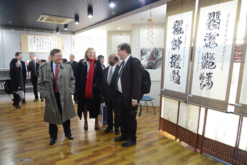 會見前,國際合作伙伴院校代表團在國際交流與合作處負責人和老師的陪同下來到我校良鄉校區參觀了校史館、圖書館和文科實踐中心,并走訪了我校教務處和學生處。在校史館,來訪院校代表了解了我校的辦學歷史,并饒有興趣的觀看了我校自建校以來在各方面所取得的成果;在圖書館和文科實踐中心,代表團對我校先進的教學設施和以學生為本的教學理念和服務工作表示贊賞。代表團一行來到教務處,與教務處負責人和相關科室的同志座談,教務處負責人介紹了我校的教學管理工作和近年來本科教學改革情況,并就本科招生情況和教學質量監控進行了交流。隨后代表團在學生處相關負責人的陪同下,參觀了學生心理素質中心的實驗室和宣泄室,并就雙方在學生管理方面所關心的問題進行了座談和交流。