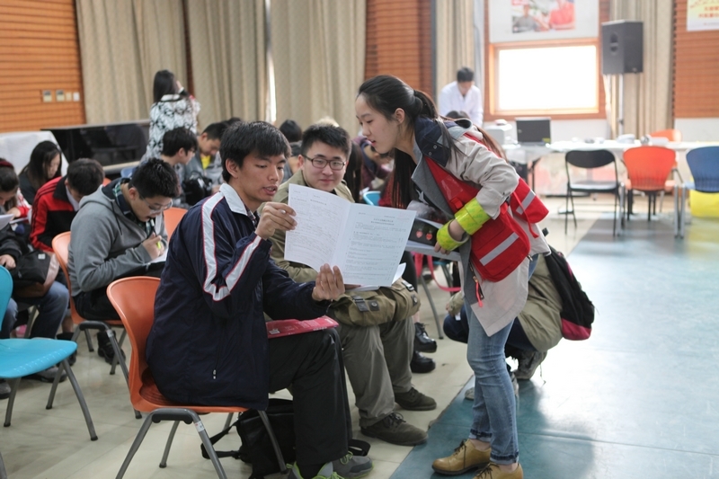 在獻血現場,有這么一群人。他們經歷過了數次的無償獻血活動,或是站在角落里默默服務,或是躲在鏡頭背后記錄下一個個動人瞬間。但今天,他和她,也是主角。在熙熙攘攘的人群中,幾抹紅色的身影格外引人注目,來自計信學院的大二學生張秋霞在獻血之后只休息了片刻就繼續投入了工作,絲毫沒有倦怠,依舊為同學們遞糖水遞面包。“以前組織獻血的時候因為身體有些疲勞錯過了機會,今天終于如愿以償了。”在其他獻完血的小女孩還在休息的時候,她開始接著為同學指引路線,胳膊上還貼著凝血的創口貼。“以前來都是忙著給別人拍照,今天自己也被別人拍一次。”一直以來在學校承擔攝影重要任務的日出工商記者團攝影部王正博如是說道,坐在椅子上的他明顯有些緊張,但是依舊笑對鏡頭,時不時跟舉著照相機的“晚輩”探討一下拍攝角度,也就忘記了抽血的疼痛。