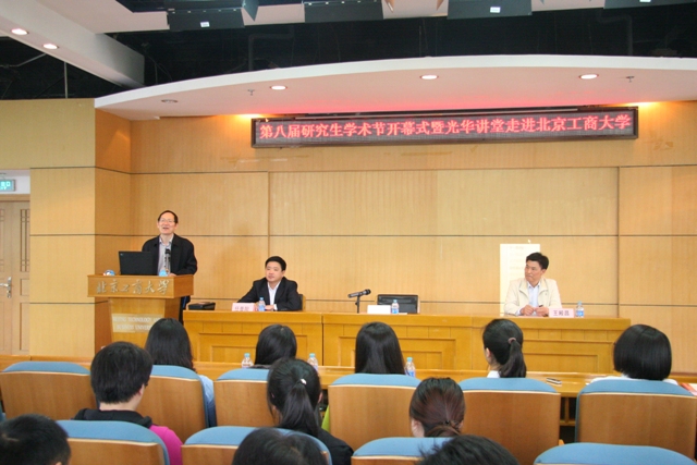 4月16日,我校第八屆研究生學術節開幕式暨光華講堂走進北京工商大學活動在阜成路校區舉行。校長譚向勇教授、中國光華科技基金會理事長兼秘書長任晉陽出席活動并講話。參加本次活動的有研究生部主任兼研工部部長楊德勇、研究生部副主任兼研工部副部長熊慧、外語學院黨總支副書記任金晶,以及各學院輔導員和研究生代表140人。