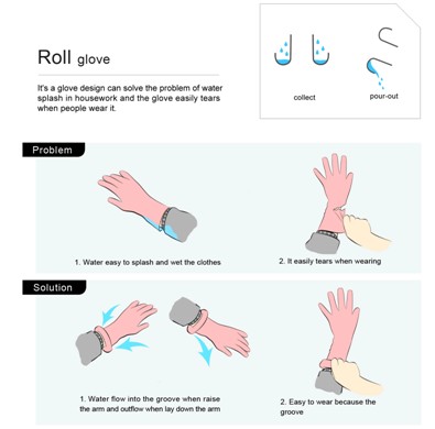 獲獎作品解決了用戶在洗東西時水會沿著手套滴入衣服或者滴撒其他地方等問題。在不增加成本的前提下在手套袖口處增加了一個卷曲結構,使水在抬手時流入卷曲結構里,放下手時水又會流出,使水不會弄到衣物上,同時也可以使用戶不必保持彎腰的姿勢以控制水的流向,減輕了用戶洗滌時的疲倦感。卷曲的結構也使用戶在穿戴手套時更方便快捷。