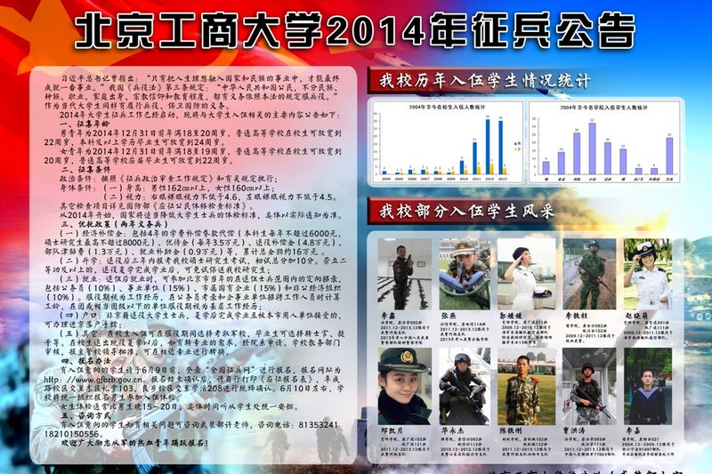 在“入伍宣傳月”中,武裝部還將通過舉辦國內外熱點軍事問題講座激發學生的責任感、使命感和從軍報國的決心;通過互聯網、微博、短信平臺等多種渠道宣傳北京市征兵優撫政策;通過“退伍老兵事跡報告會”、參觀部隊、觀看征兵宣傳視頻等多種形式讓有入伍意愿的學生更加全面、生動的了解部隊生活。