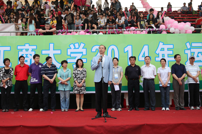 在閉幕式講話中,盧思鋒副書記指出,本屆運動會在全體師生和各有關部門共同努力下取得了圓滿成功,其中,與往年相比第一次冒雨參賽,更加體現了運動員的體育運動精神和裁判員的公平公正;第一次使用了由藝傳學院學生設計的獎牌,第一次使用了電子計時器和航拍的手段等,在創意、技術手段等方面開創先河。盧思鋒對全體參賽運動員、參與開幕式表演的全體學生和千名教職工表演廣播操,帶頭踐行體育精神提出表揚,并感謝所有為運動會的組織、裁判和競賽做出貢獻的工作人員和和服務保障人員。他特別提到,在師生的努力籌備、積極訓練下,全體大一女生在我校歷史上第一次實現了千人熱力操的表演,在體能、體質和意志上得到了鍛煉;心理素質表演中五百多名學生自編自導的竹竿舞、五環繩圈表演等節目表演都非常精彩,具有獨創性,將舞蹈和體育精神融合,展現了大學生團結進取的精神風貌。盧思鋒提出,希望同學們堅持積極開展體育鍛煉,增強身體素質,德智體美全面發展;希望在不久的將來實現與外國學生同場競技的設想,把北京工商大學的運動會辦得更加高端化、國際化;希望同學們共同努力,努力學習、各展所長。