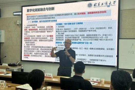 在課堂講授之外,本次培訓班專門設置了實踐研學環節,組織學員前往北京工商大學校內智慧校園建設平臺及重點科研平臺進行現場調研,深入了解高校在服務產業轉型中的科技支撐與創新成果。調研內容包括北京工商大學數字未來中心、化妝品監管科學研究基地和中國輕工業釀酒分子工程重點實驗室三大平臺,涵蓋了數字技術賦能產業發展、消費品安全監管科學研究、傳統產業智能化轉型等多個領域,有效促進了理論與應用的深度融合,幫助學員拓展了對數字化、綠色化和科技化驅動產業升級路徑的理解。