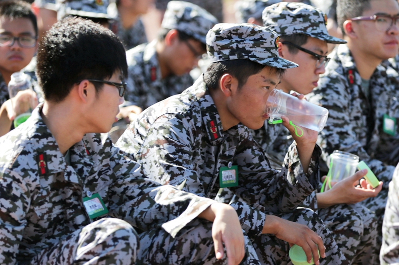 訓(xùn)練場上,太空杯整齊的排列在馬扎的旁邊。一到休息時間,軍訓(xùn)新生們便每人手提著一只相同款式、顏色各異的太空杯來到接水處,排著整齊的隊伍接水、喝水。小小太空杯起到了大作用。