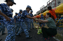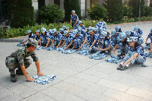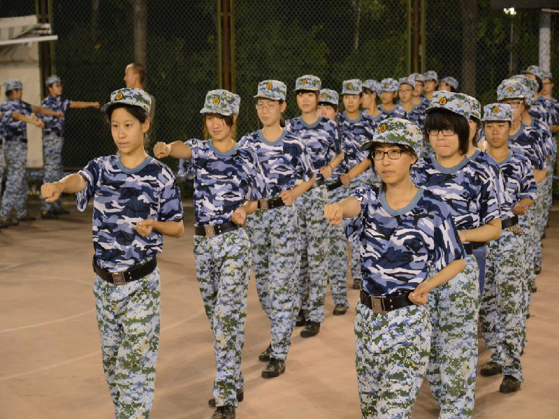 站軍姿是軍訓的第一個項目,也永遠是最辛苦的項目。迷彩與綠地渾然一體,目之所及,學員們像遠處默然不語的電線桿般肅然而立,即使濕透的汗衫讓他們感到不舒服,但卻仍堅持著,保持著每一個姿勢。“兩腳跟靠攏并齊,兩腳尖向外分開60度;兩腿挺直;小腹微收,自然挺胸;上體正直,微向前傾;頭要正,頸要直,口要閉,兩眼目視正前方”,教官略帶沙啞的嗓音感動了站在場邊的記者。