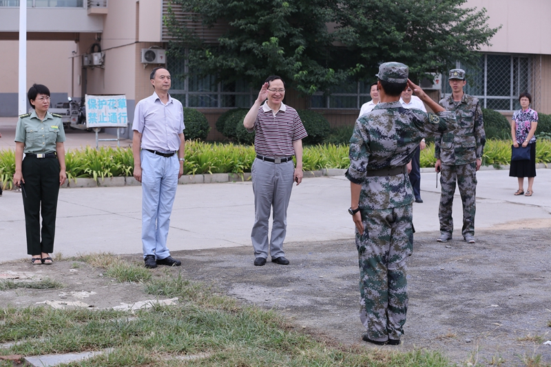 譚向勇書記首先到軍訓現場視察。在各訓練點,2014級學生們響亮的口號、整齊的步伐、有序的物品擺放,昂揚的精神面貌,都得到了譚向勇書記的肯定。他對工作在軍訓一線的帶隊輔導員們以及各方面保障人員表示慰問,對部隊6天來的辛苦施訓表示感謝,并要求軍訓團做好統籌協調工作,在老生返校開始上課后,盡可能減少與新生軍訓的相互干擾。