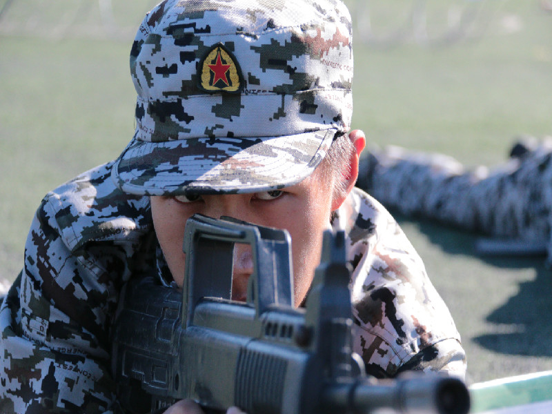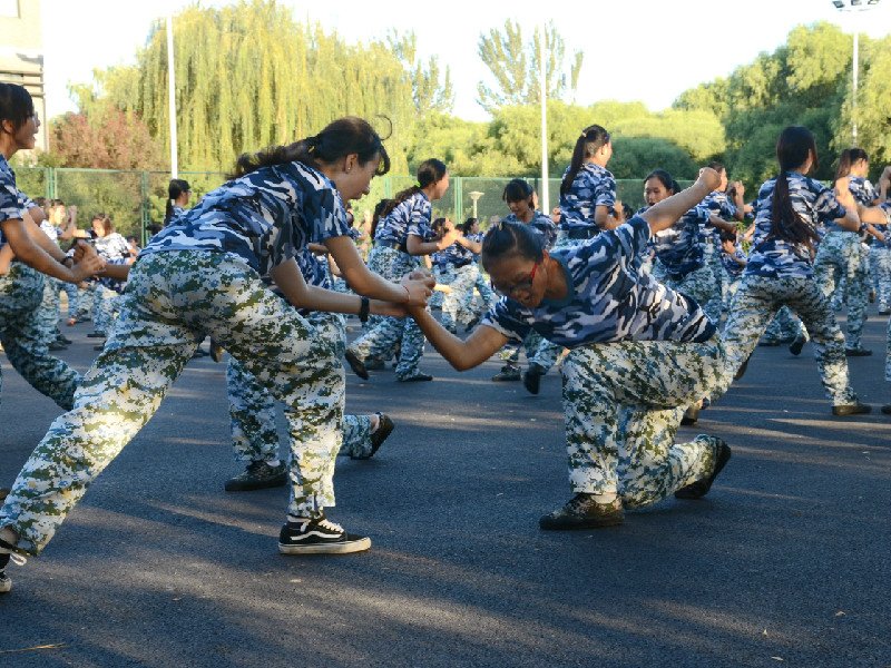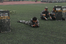 操場上的草地與新生身上的迷彩軍裝相互輝映,使新生們顯得活力十足。五營的男生們有的進行表演科目訓練,有的進行隊列訓練。教官們不僅嚴格要求,更時不時親自示范,并手把手糾正基本動作,同學們在教官的帶領下認真訓練,絲毫沒有半點偷懶,操場上時常可以聽見新生們響亮的口號聲。與此同時,五營的女生們正在進行緊張的隊列訓練,伴著分列式背景音樂,同學們不斷調整步伐,確保跟上音樂的節拍,達到整齊劃一的效果。放眼望去,那整齊的步伐,筆直的站姿,堅定的面容,炯炯的眼神,鏗鏘的歌聲……無不顯示出十余日刻苦訓練所帶來的成果。