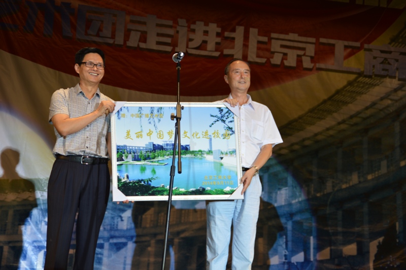 黨委副書(shū)記盧思鋒代表學(xué)校對(duì)中國(guó)廣播藝術(shù)團(tuán)來(lái)到房山良鄉(xiāng)演出表示歡迎。他表示,在廣播藝術(shù)團(tuán)黨委書(shū)記陳玉璽和馮鞏團(tuán)長(zhǎng)的帶領(lǐng)下,中國(guó)廣播藝術(shù)團(tuán)取得了一項(xiàng)又一項(xiàng)的成就,演員們的敬業(yè)精神和良好的藝術(shù)造詣值得我們肯定。我校與廣播藝術(shù)團(tuán)雙方良好的合作以及校領(lǐng)導(dǎo)、全校師生與演員之間的深厚情誼使得中國(guó)廣播藝術(shù)團(tuán)連續(xù)幾年走進(jìn)我校演出,深得師生喜愛(ài)。盧思鋒副書(shū)記代表學(xué)校向藝術(shù)團(tuán)贈(zèng)送了印有北京工商大學(xué)校園風(fēng)景畫(huà)的紀(jì)念品,希望雙方能夠繼續(xù)合作,不斷提高師生的文化素養(yǎng),豐富校園文化生活。中國(guó)廣播藝術(shù)團(tuán)黨委書(shū)記陳玉璽表示,為基層演出、為群眾服務(wù)是藝術(shù)團(tuán)的宗旨。陳書(shū)記代表馮鞏團(tuán)長(zhǎng)及各位藝術(shù)家祝全校師生工作愉快,追夢(mèng)逐夢(mèng),共同實(shí)現(xiàn)偉大的中國(guó)夢(mèng)。