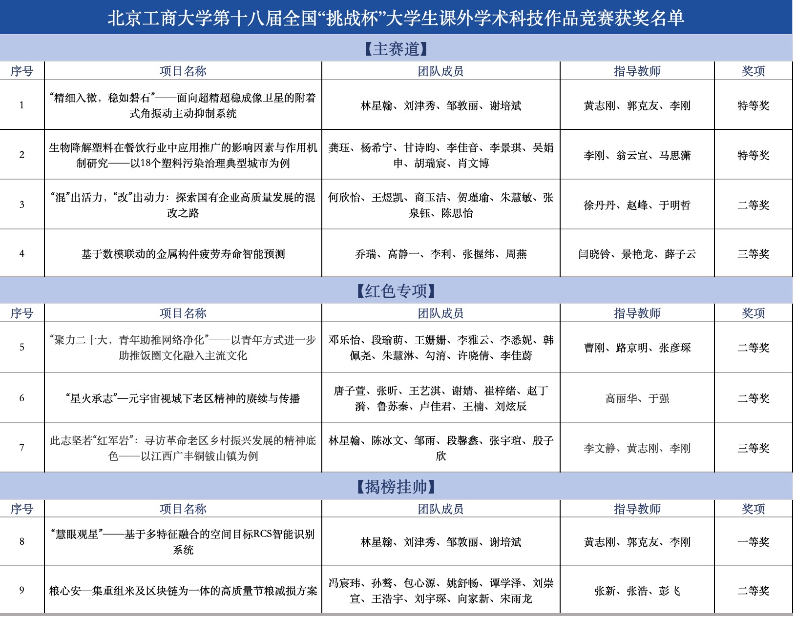 10月30日,第十八屆“挑戰杯”——全國大學生課外學術科技作品競賽,全國終審決賽圓滿落下帷幕。北京工商大學摘得主賽道特等獎2項、二等獎1項、三等獎1項;紅色專項賽道二等獎2項三等獎1項;揭榜掛帥賽道一等獎1項、二等獎1項。獲獎項目數量創歷史新高!獲獎項目質量創歷史新高!