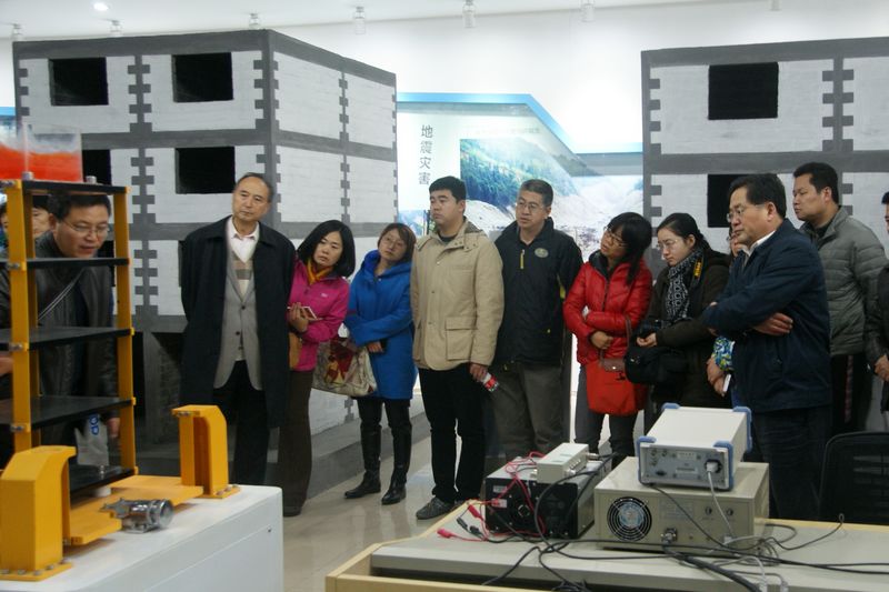 在齊福榮書記的全程陪同下,考察團參觀了校史館、火山科學園地、地震模擬振動臺和災害模擬實驗室和工程地質實驗場。在參觀展示火山內容的科學園地時,地質學專家蔣靖祥研究員介紹了采自我國四大火山群的火山巖標本、火山活動與板塊構造的關系。在地震模擬振動臺、災害模擬實驗室和地下結構與工程地質實驗場,防災工程專家郭迅教授演示了砂土液化、滑坡、泥石流等與地震災害相關的各類實驗,講述了地震對于不同形態建筑的影響及目前有效的隔震技術和避震手段。