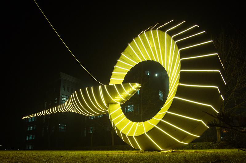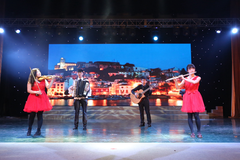 2015年新年鐘聲即將敲響,校園里彌漫著熱鬧歡慶的氣息。樹梢上五顏六色的彩燈點亮了夜空,“百花”雕塑上懸掛著的“2015”絢麗奪目,天橋上閃爍著的霓虹燈繽紛爛漫。文體館內,師生們為一年一度的元旦晚會做著積極的準備。