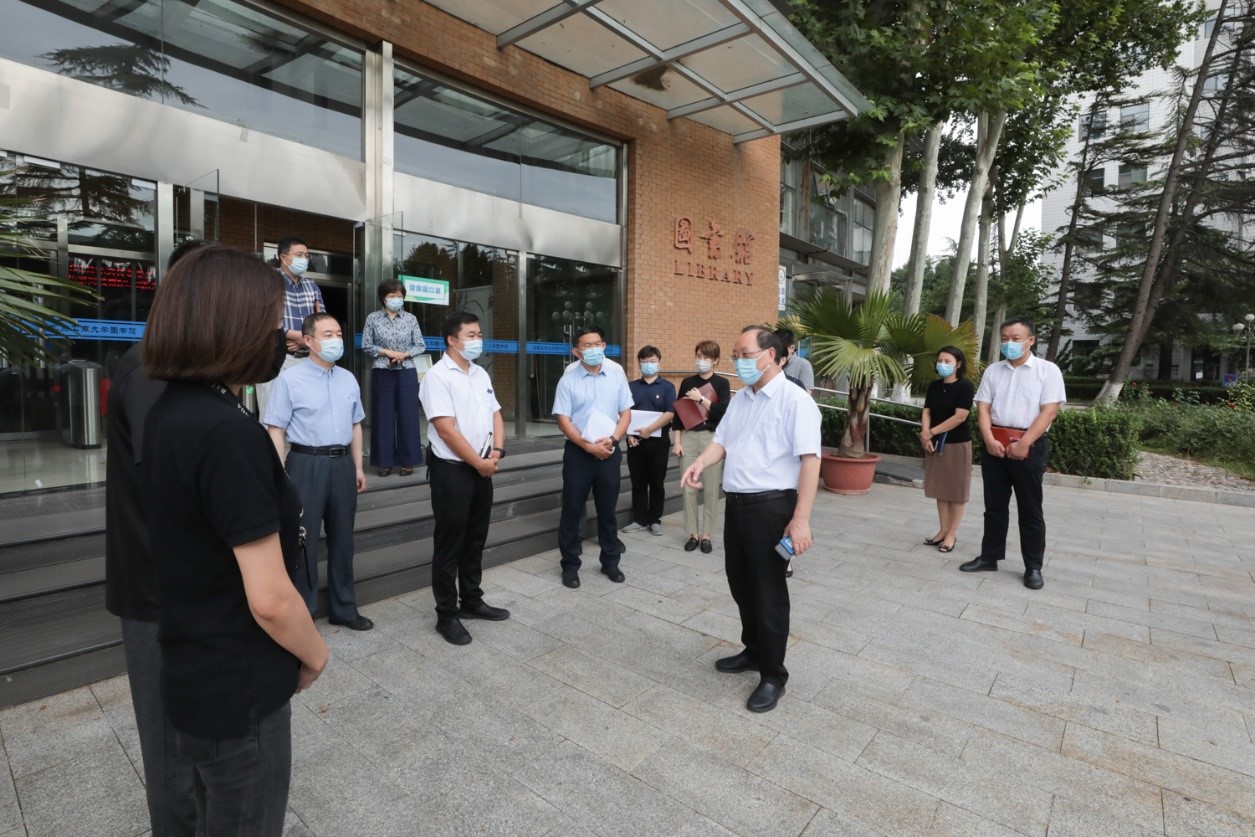 黃先開一行先后實地檢查了阜成路圖書館、西區核酸采樣點、西區操場、教三樓、東西校區校門等防疫關鍵點位。在圖書館對學生出入、預約占座、應急處置等情況進行實地查看,強調圖書館是人員密集場所,要堅決擔負起防疫主體責任,認真落實各項防控措施。在教一樓核酸采樣現場查看了核酸檢測采樣情況、并看望慰問了一線醫護人員和黨員志愿者。在西區操場,對新生開學典禮準備工作提出要求,典禮現場要落實一米間隔防疫規定,督促師生現場佩戴好口罩,確保開學典禮順利舉行。在教三樓教室改造施工現場,查看了施工現場疫情防控情況及改造進展,強調要統籌兼顧疫情防控和施工質量,在落實疫情防控的前提下加快推進施工進度,通過教室改造營造校內良好學習氛圍。在東西區的大門處,詳細查看了入校人員查證、掃碼、測溫的執行情況。