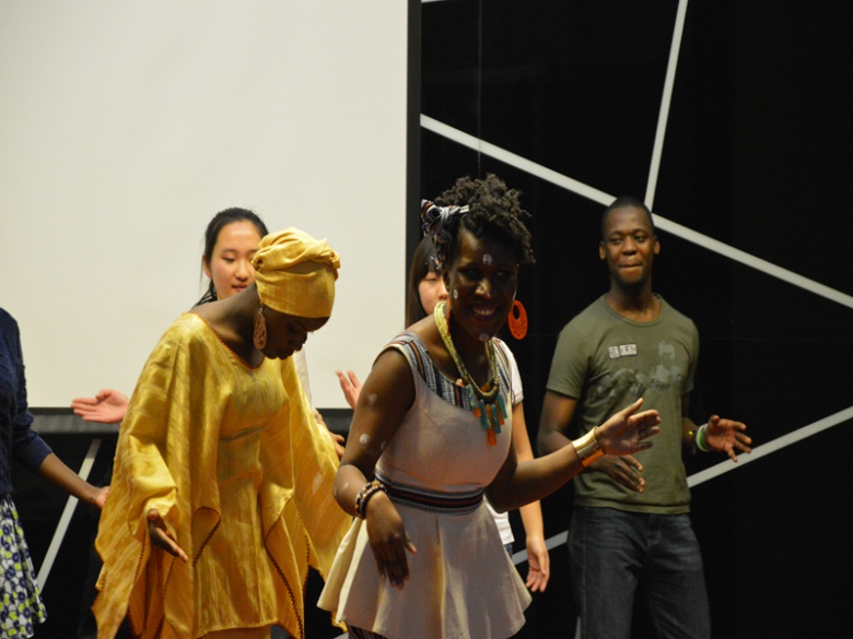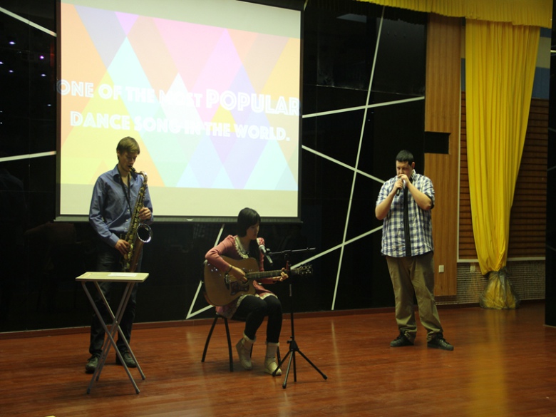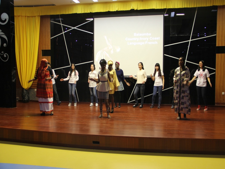 主題活動主要分為 “我最美”自我介紹、大洲最美風采秀、文化互動零距離三個部分。活動現場掛滿了各國國旗,文化視聽盛宴就此拉開帷幕。各組成員用英語、法語、韓語、漢語等多種語言進行“我最美”自我介紹,使觀眾在一開場便感受到不同國家的文化魅力。亞洲組同學們的民族服飾走秀,小篆、行書、民俗剪紙,舞蹈《江南stlye》等將傳統與時尚結合使觀眾們感受到亞洲深厚的文化底蘊;歐洲組的同學們以薩克斯、吉他演奏與B-box表演開場,并為在場觀眾帶來了輕松歡快的舞蹈表演《瑪卡雷娜》(《Macarena》),使大家感受到了歐洲國家的獨特風采;非洲組為大家表演了吉布提傳統歌曲《Rahma Rose》,科特迪瓦民族舞蹈《Balaumba》,向觀眾展示來自非洲的濃烈熱情。活動中,各組隊員還制作了韓式泡菜炒飯、德式煎土豆及非洲古斯面等多種美食,與全場觀眾一同分享制作過程。學習民族舞蹈、共同演唱歌曲、品嘗特色美食使觀眾零距離文化互動,從多個角度感受東西文化碰撞,體驗國際文化無國界。