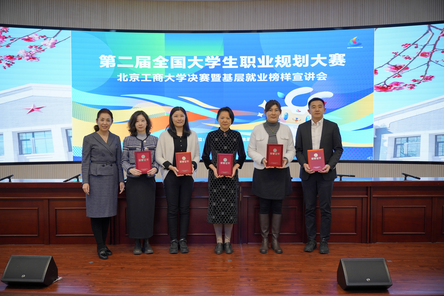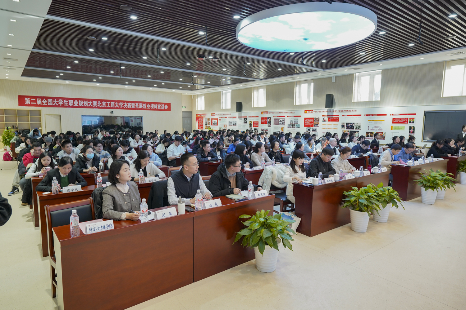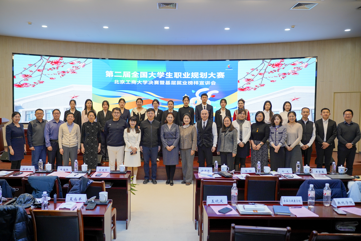 12月25日,第二屆全國(guó)大學(xué)生職業(yè)生涯規(guī)劃大賽北京工商大學(xué)決賽暨基層就業(yè) 榜樣宣講會(huì)在良鄉(xiāng)校區(qū)舉辦。黨委常委、副校長(zhǎng)徐丹丹出席并致辭。招生就業(yè)處處長(zhǎng)石松,學(xué)生處處長(zhǎng)鄭光,團(tuán)委書(shū)記單紫薇,教務(wù)處副處長(zhǎng)、創(chuàng)新創(chuàng)業(yè)學(xué)院院長(zhǎng)蓋曉慶,招生就業(yè)處副處長(zhǎng)劉晶以及各學(xué)院分管就業(yè)工作的副書(shū)記、師生代表參加了此次活動(dòng)。教育部高校學(xué)生司就業(yè)服務(wù)處周紫陽(yáng)、大興區(qū)人力資源和社會(huì)保障局辦公室主任楊晨應(yīng)邀出席。大賽特邀中國(guó)人民大學(xué)、北京外國(guó)語(yǔ)大學(xué)、北京中醫(yī)藥大學(xué)就業(yè)負(fù)責(zé)人及企業(yè)代表?yè)?dān)任評(píng)委。大賽由招生就業(yè)處孫碩主持。