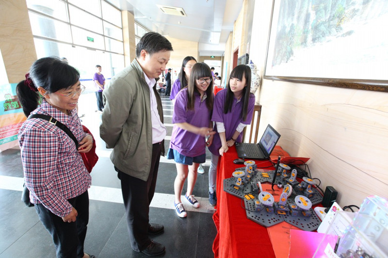 在展出的學(xué)生科技作品中,書法機器人、智能巡跡小車、智能熱水器、超市手機購物APP、電子密碼鎖等一件件實用而有創(chuàng)意的學(xué)生作品吸引了大家的目光,師生不時駐足觀看,有的還饒有興趣的進行了動手操作。