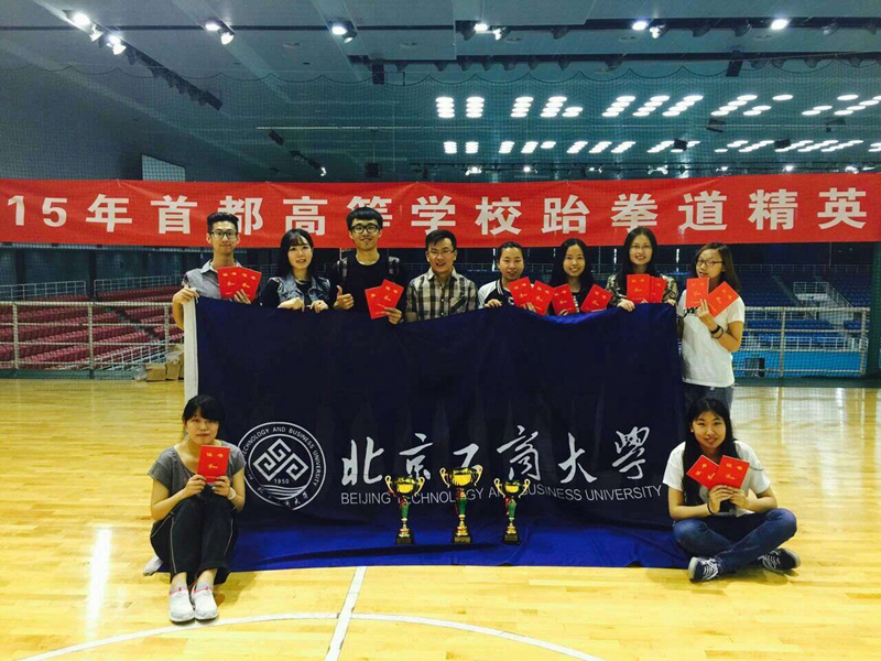 5月16號, 2015年首都高等學(xué)校跆拳道精英賽在北京科技大學(xué)跆拳道奧運(yùn)場館順利舉行。我校跆拳道隊(duì)在17所高校參賽的乙組比賽中取得團(tuán)體總分第二名、女子團(tuán)體第一名、男子團(tuán)體第四名、品勢女子團(tuán)體第三名的驕人成績。這次比賽是英語111班楊弋戈隊(duì)長的告別賽,首場對陣有高水平特招資格的北交大實(shí)力隊(duì)員,他全心謹(jǐn)慎同時(shí)堅(jiān)決進(jìn)攻,最后以9:3的絕對實(shí)力順利晉級;并在決賽中以13:1的絕對比分,穩(wěn)獲本級別冠軍。彭世禹同學(xué)在男子品勢比賽中動(dòng)作準(zhǔn)確規(guī)范、節(jié)奏連貫氣力十足,取得了第一名的好成績。首次參賽的物流141的白梓凝同學(xué),以優(yōu)秀的跆拳道競技能力和賽場的良好發(fā)揮,最終也獲得了競技女子49KG的冠軍,她在賽前艱難的完成了3.5kg的控體重任務(wù)。