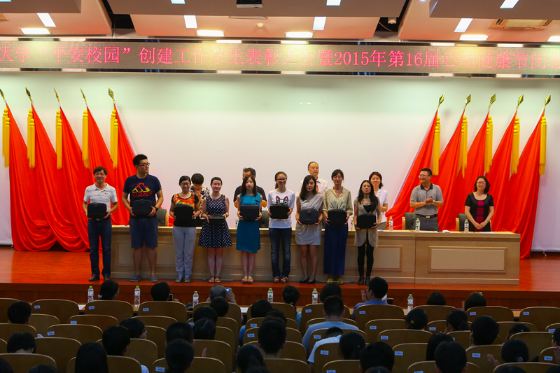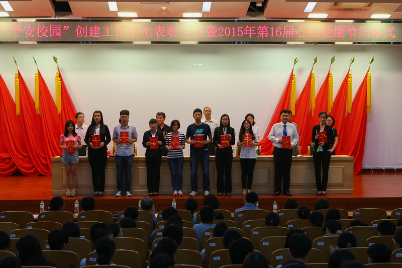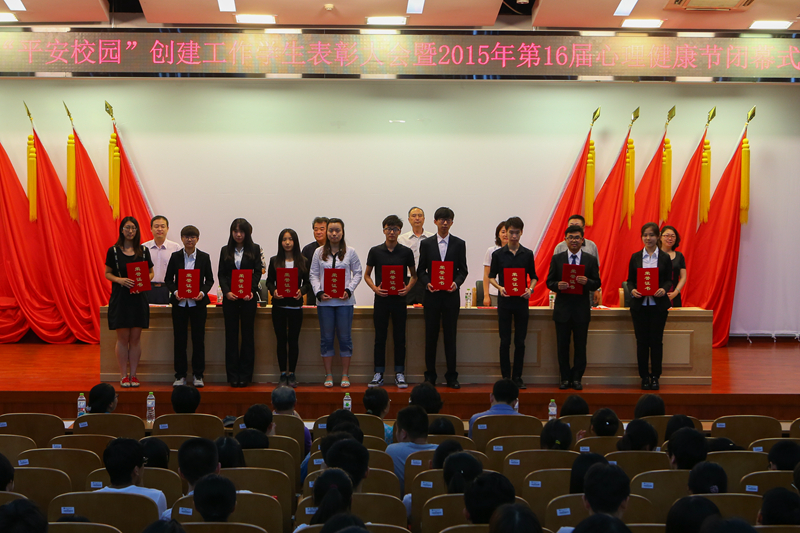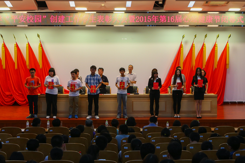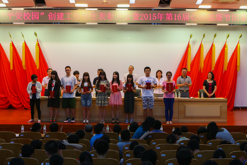 張春萍宣讀了平安校園創(chuàng)建工作學(xué)生表彰決定,學(xué)校共有52個集體、484名學(xué)生以及101項平安校園創(chuàng)作作品獲得表彰。呂良宣讀了2015年心理健康節(jié)表彰決定,學(xué)校共有5個集體和36名學(xué)生獲得表彰。