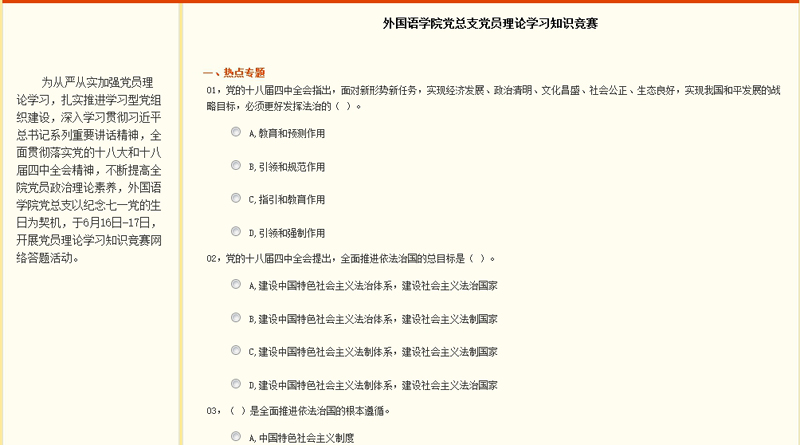 為從嚴從實加強黨員理論學習,扎實推進“三嚴三實”專題教育,建設學習型黨組織,外國語學院黨總支實現“互聯網+” 理論學習創新,近期開展黨員理論學習網絡知識競賽活動,各個黨支部廣泛參與,“以賽促學”,開展理論學習及專題研討,以實際行動紀念“七一”黨的生日。