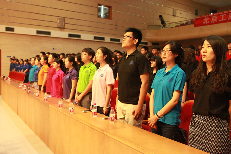 在奏唱國歌聲中,出征儀式拉開帷幕。學校團委書記呂良介紹了本次暑期社會實踐活動背景及情況。為深入學習宣傳貫徹黨的十八大和十八屆三中、四中全會及習近平總書記系列重要講話精神,引領廣大青年學生按照習近平總書記關于“勤學、修德、明辨、篤實”的要求,樹立和踐行社會主義核心價值觀,為實現“四個全面”戰略布局和中國夢努力奮斗的理想信念,在北京市團委的大力支持下,“十鄉百村千人行”已成為我校品牌活動。今年暑假,學校繼續組織全校學生深入開展以“踐行核心價值觀·投身‘四個全面’建設”為主題的實踐活動,分為集中和分散兩種形式進行。集中實踐將延續我校傳統社會實踐項目“十鄉百村千人行”,內容包括對接中學開展暑期夏令營支教活動、紀念抗戰70周年紅色主題宣傳教育實踐活動、調研新農村民生現狀、基層志愿活動等。此外,還將開展“共聚社區青年匯”城市發展服務計劃、“創業園夢,開拓進取”就業創業狀況考察及創業實踐活動、“科技筑夢、助力發展”科技創新實踐活動、“紀念抗戰勝利70周年”愛國主義學習調研活動、“共筑中國夢,青春在踐行”思想教育主題活動及“青年奉獻社會”志愿服務行動。分散實踐將由學生自由組隊開展活動。另外,今年學校還為每名參加“十鄉百村千人行”集中實踐的同學上意外傷害保險,以保障同學們在實踐期間的人身安全。此次活動力求以理論學習、政策宣講、基層建設、走訪調研、志愿服務等實踐形式,立足首都,面向全國。