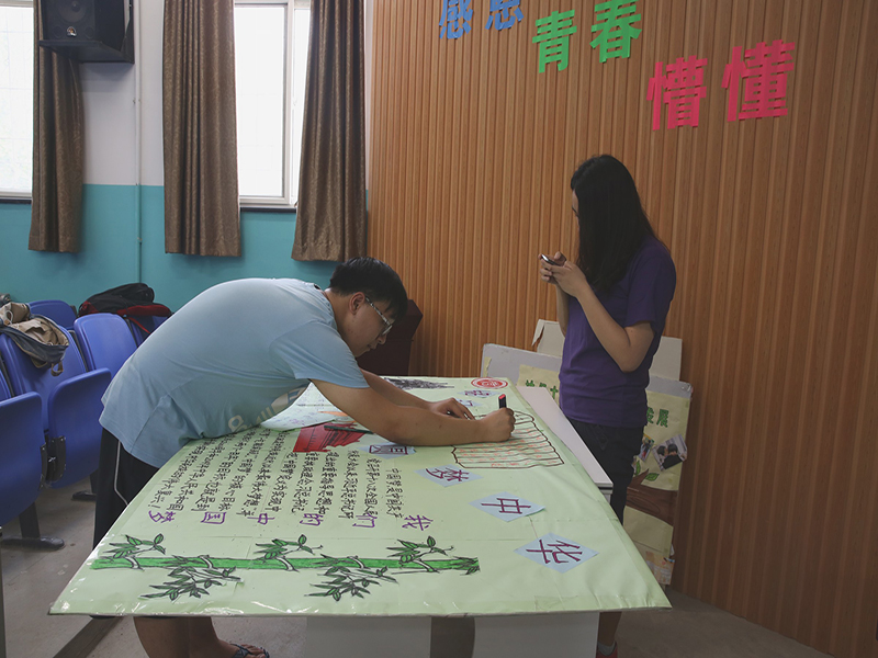 回到校園后,同學們抓緊時間進行備課。全體支教人員在李鑫、李娜老師的組織下,為接下來幾天的課程做試講。此次試講學科豐富,除了傳統的語文,英語,數學外還包含歷史,體育等。歷史課的“老師”們站在講臺之上,結合自己做的演示文稿一遍遍演示;數學課的“老師”們也在討論著每道題的不同解決方法;手工課的“老師”們也為同學們準備著明天的禮品。