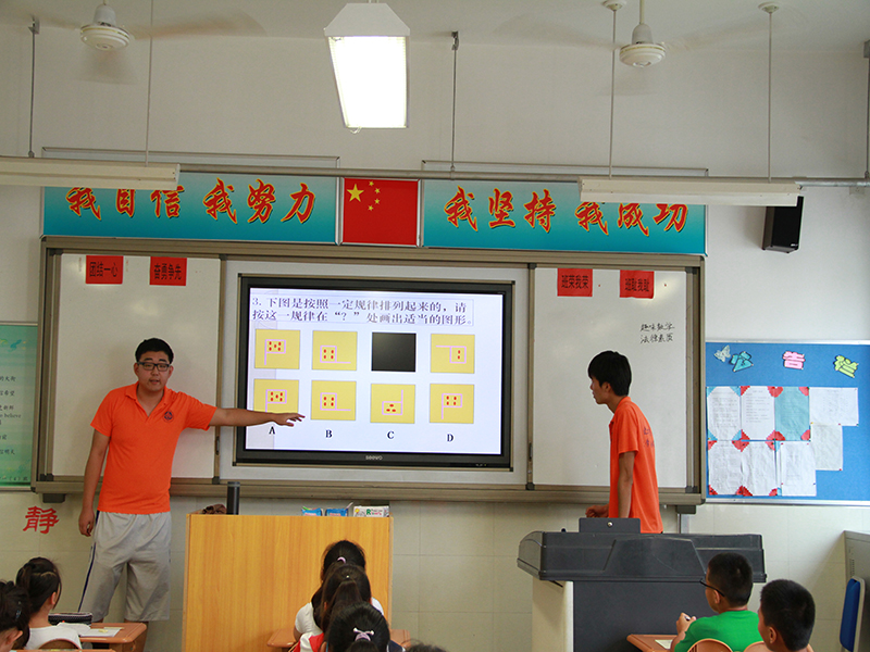 數(shù)學(xué)課上,同學(xué)們從淺入深,從易到難為支教學(xué)校學(xué)生準(zhǔn)備了許多趣味數(shù)學(xué)題,為激發(fā)孩子們的學(xué)習(xí)熱情,還精心準(zhǔn)備了小禮品;國學(xué)課上,小老師們帶領(lǐng)孩子們遨游在詩書的海洋,領(lǐng)略古今中外名人大家的作品;音樂課上,教室里看得見老師與學(xué)生一起跳《小蘋果》的身影,聽得見民歌悠揚(yáng)的旋律。