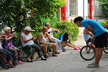 藝術(shù)與傳媒學(xué)院暑期實(shí)踐分團(tuán)藝術(shù)組則來到南召中學(xué)旁邊的北京市房山區(qū)琉璃河青少年敬老樂園為老人們帶來慰問演出。隨著演出的開始,文藝組同學(xué)們的歌聲和舞姿吸引了越來越多的老人過來,當(dāng)準(zhǔn)備的節(jié)目表演完畢,一些老人還意猶未盡,文藝組同學(xué)完美的即興發(fā)揮也贏得了老人們的熱烈掌聲,尤其是帶隊(duì)老師徐老師和程老師的參演更是將演出推向了高潮。在演出進(jìn)行的同時(shí),實(shí)踐團(tuán)成員付晟蓉同學(xué)和周思達(dá)同學(xué)為老人們畫了速寫,老人們紛紛稱贊“畫得可真像!”“真棒!”。