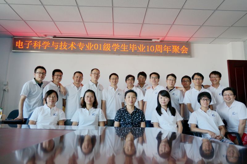 同日,電子科學與技術專業01級近30位校友畢業十周年聚會在計信學院會議室舉行。原班主任牟芳,任課老師陳巖參加活動。四年同窗情,十年離別意,校友們激動相擁,感慨萬千,并逐一向老師們匯報了自己的工作情況,也向學校表達了對學校的美好祝愿,希望學校和學院發展更進一步。隨后大家參觀了學校,部分校友還到廊坊東方大學城尋找當年的足跡,重拾在那的籃球激情。大家都表示十年時間很快,一直非常感激學校培育之情,在工作崗位上也不忘北京工商大學校友身份踏實工作,用杰出工作成績回饋母校,回報社會。