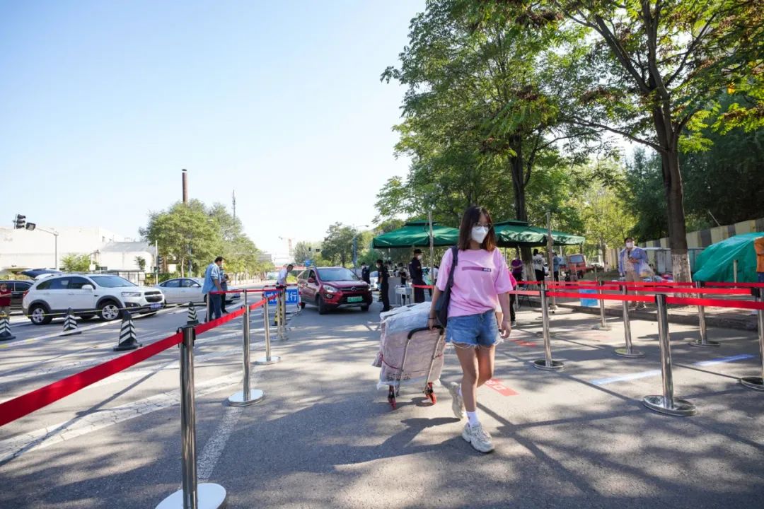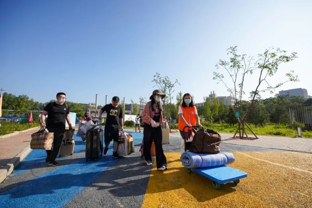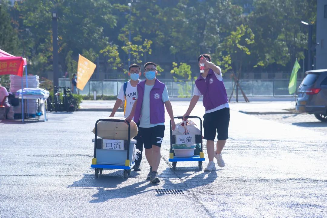 學(xué)校對(duì)每位入校的新生進(jìn)行嚴(yán)格把關(guān),校門外,安保人員細(xì)致核驗(yàn)新生身份與健康信息,并進(jìn)行測(cè)溫。根據(jù)疫情防控要求,家長(zhǎng)不能入校陪同,志愿者們排成一行隨時(shí)待命,幫助新生搬運(yùn)行李,引導(dǎo)護(hù)送新同學(xué)順利前往迎新點(diǎn),搭建起一條暢通無(wú)阻的行李“傳送帶”。