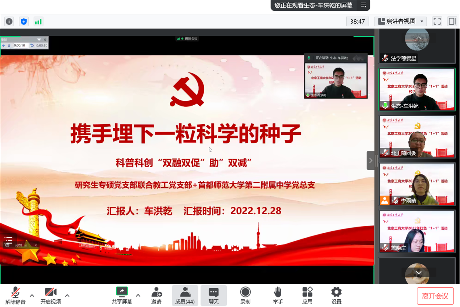 今年的紅色“1+1”活動(dòng)以“請(qǐng)黨放心 強(qiáng)國(guó)有我”為主題,緊密?chē)@學(xué)習(xí)宣傳貫徹黨的二十大精神這一中心內(nèi)容展開(kāi)。我校共有15個(gè)黨支部完成共建任務(wù),經(jīng)申報(bào),12個(gè)支部進(jìn)入最終的評(píng)審環(huán)節(jié)。評(píng)審會(huì)上,各學(xué)生黨支部通過(guò)5分鐘展示再現(xiàn)了本支部與共建單位開(kāi)展的各項(xiàng)活動(dòng)。