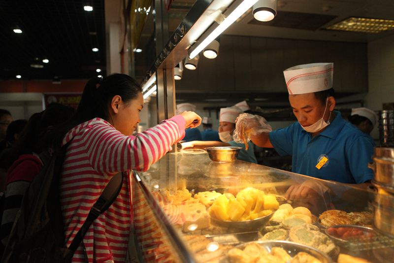 然而僅是早餐種類和數量上的增多是不夠的。記者了解到,考慮同學不同時間段的用餐需求,食堂的工作人員每天凌晨4:30就開始準備早飯;值班經理也在同一時間到達學校進行安全把關。負責打飯的工作人員每天提前10分鐘上崗,并在高峰期新增兩個窗口,保證6個隊伍同時可以購買早餐,節約排隊時間。張小奕同學說,“最開始的時候,只要稍微晚起了一會,就會看見窗口的隊伍非常長,經常排到自己的時候有些愛吃的已經沒有了。還好食堂及時調整,不僅吃到了想吃的東西,而且有足夠的時間做課前準備。”15級新生李楠也興奮地告訴記者,“以前每天晨跑之后就要趕緊跑去食堂,一個人排隊,一個人占好位置,現在就方便許多,食堂從6:40就可以就餐,部分同學選擇晨跑之前吃飯,兩個就餐高峰分開,人少了許多,也不用再去占座位了。” 不僅如此,為了方便教學區晨讀晨練的學生用餐后直接上課,后勤處特別在師生服務中心食堂、文二樓一層同時為同學們準備了早餐。