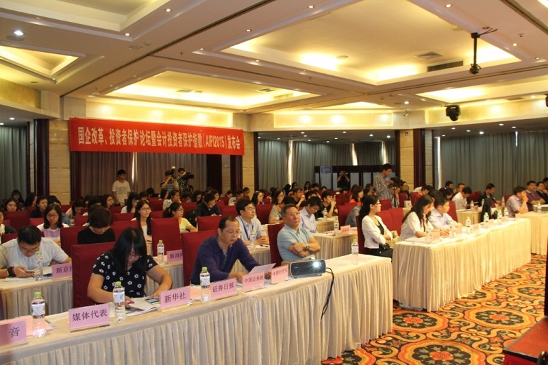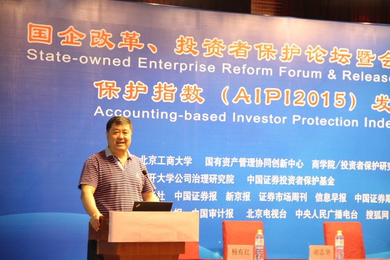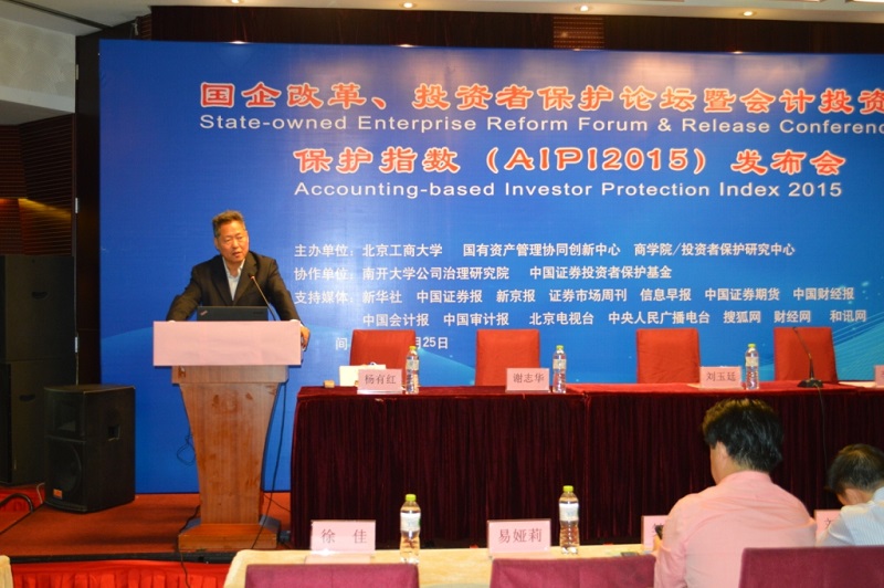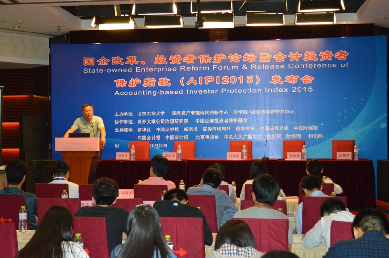 9月25日,我校召開中國上市公司投資者保護(hù)論壇暨會計投資者保護(hù)指數(shù)(AIPI2015)發(fā)布會,第六次發(fā)布該指數(shù)。財政部會計司、企業(yè)司原司長劉玉廷,中國企業(yè)財務(wù)管理協(xié)會副會長李永延,中國社會科學(xué)院財經(jīng)戰(zhàn)略研究院院長高培勇,我校副校長謝志華出席發(fā)布會并作主題演講。《中國證券報》、《會計研究》等在京媒體及專業(yè)期刊、上市公司及投資機(jī)構(gòu)代表、在京高校和科研機(jī)構(gòu)代表以及商學(xué)院部分教師和學(xué)生共計100余人參加了發(fā)布會。發(fā)布會由科技處處長楊有紅主持。