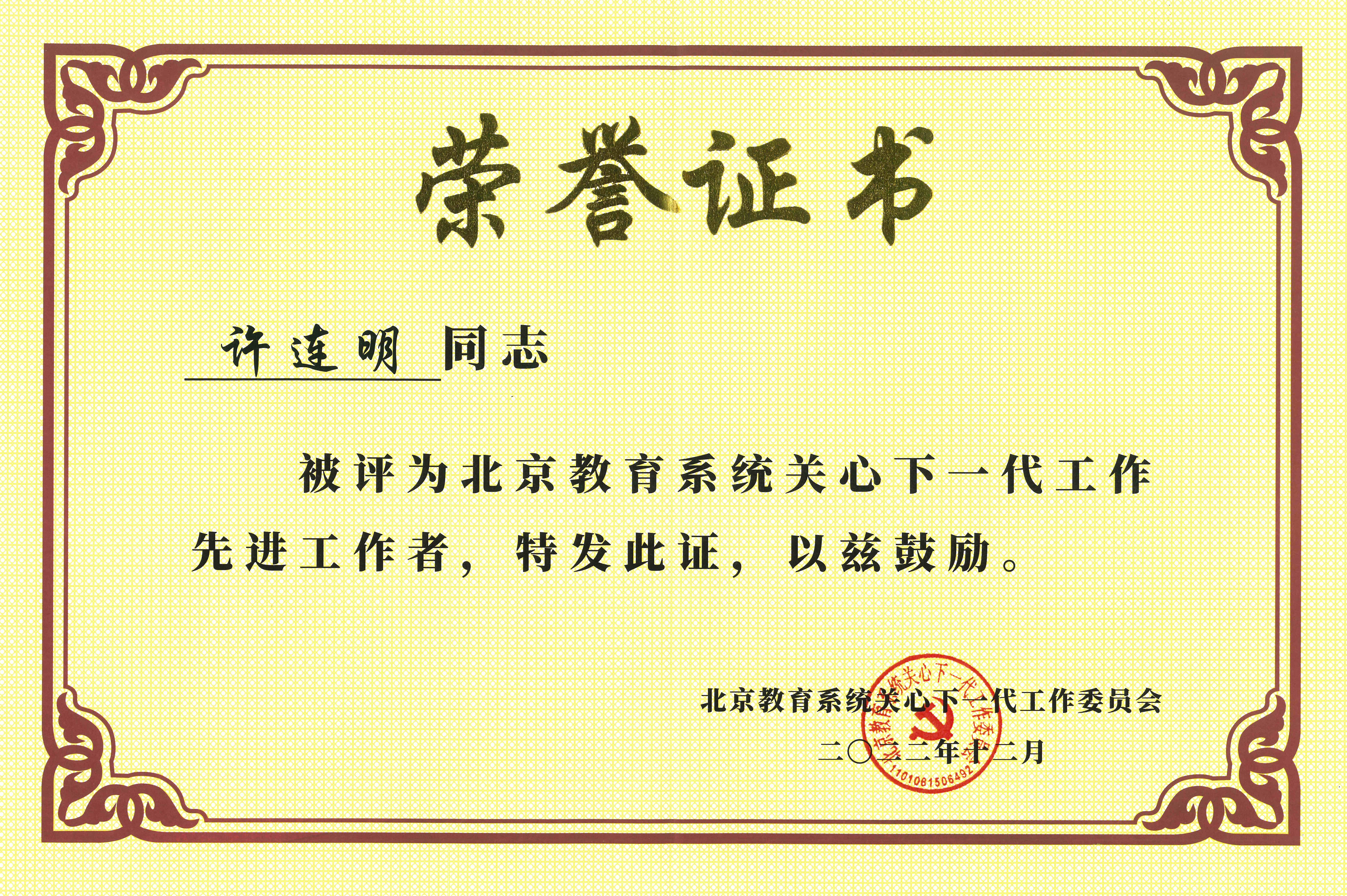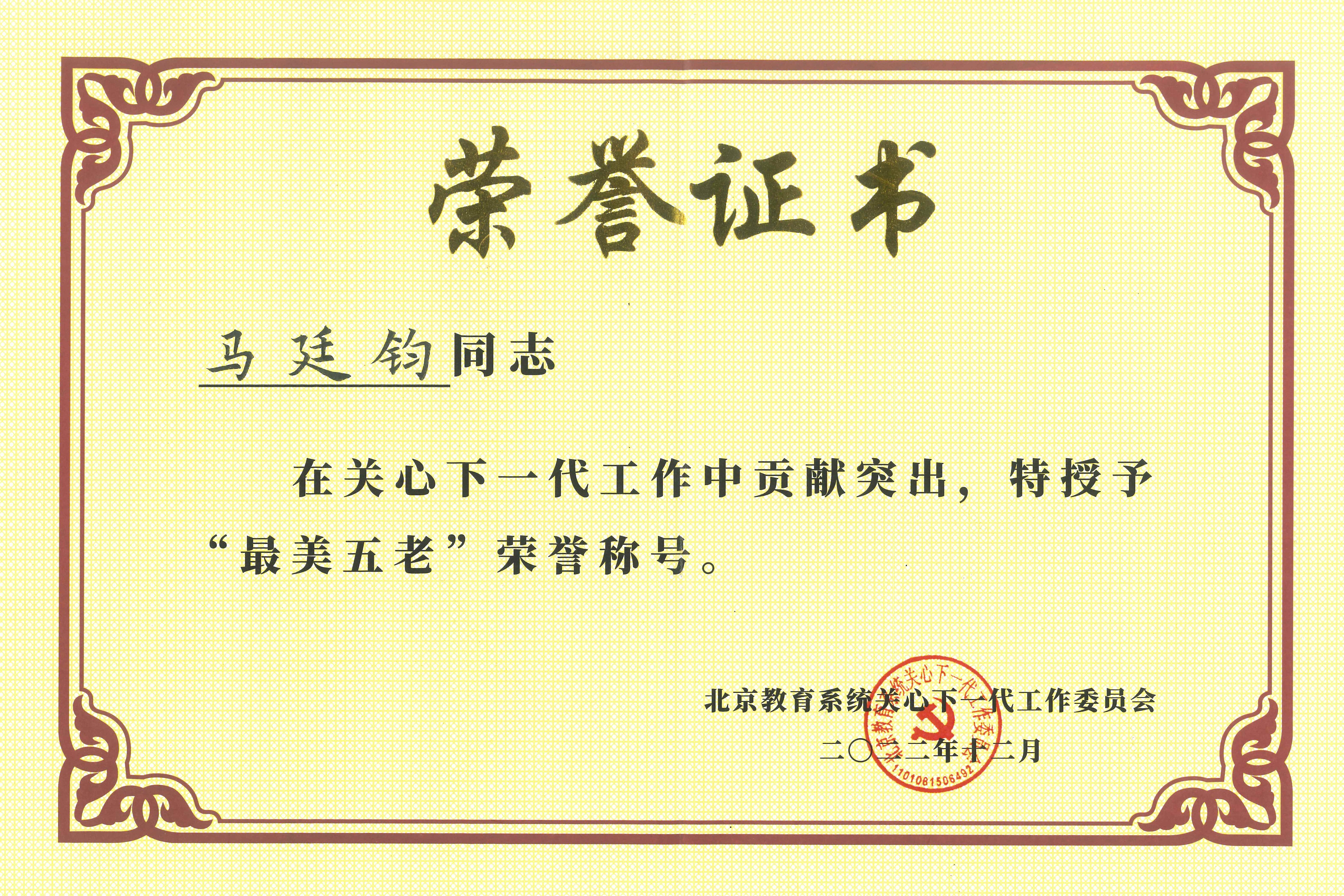 大會表彰了北京教育系統關心下一代工作先進集體、先進個人、最美“五老”。我校關工委和本科教學督導專家組獲得“北京教育系統關心下一代工作先進集體”榮譽稱號,許連明獲得“北京教育系統關心下一代工作先進個人”榮譽稱號,馬廷鈞獲得“北京教育系統關心下一代工作‘最美五老’”榮譽稱號。