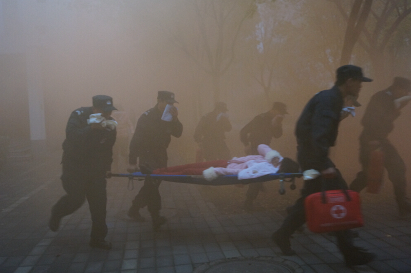 下午四點半,隨著執(zhí)行指揮保衛(wèi)處副處長楊東杰的一聲令下,消防演習正式開始。此時,10號樓警報鳴響,煙霧滾滾,600余名新生分別從一、三、五組團迅速而有序地疏散到集結區(qū)。參演學生根據在消防培訓中學到的知識,以毛巾掩住口鼻,彎腰快步地從煙霧中撤離到指定地點。模擬現場非常逼真,疏散過程緊張而流暢。現場還設置了“消防逃生體驗帳篷”,用于真實模擬逃生過程,給人以身臨其境的感覺,參演學生也都踴躍參與體驗。隨后,參演學生在生活區(qū)操場集合,在楊副處長的講解和示范下進行了滅火演練實操。保安人員點燃了巨大的火堆,參演的師生熱情高漲,嚴肅認真,親身體驗了滅火器的實際操作,取得了良好的培訓效果,也達到了預期的教育目的。最后,按照預定安排,由保安人員給師生示范用消防水帶將火堆徹底撲滅。