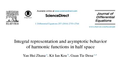 近期, 我校理學院張艷慧副教授以署名第一作者身份,在世界一流數(shù)學期刊《微分方程雜志》(Journal of Differential Equations)發(fā)表論文《半空間中調和函數(shù)的積分表示和漸進性質》(Integral representationand asymptotic behavior of harmonic functions in the half space)。