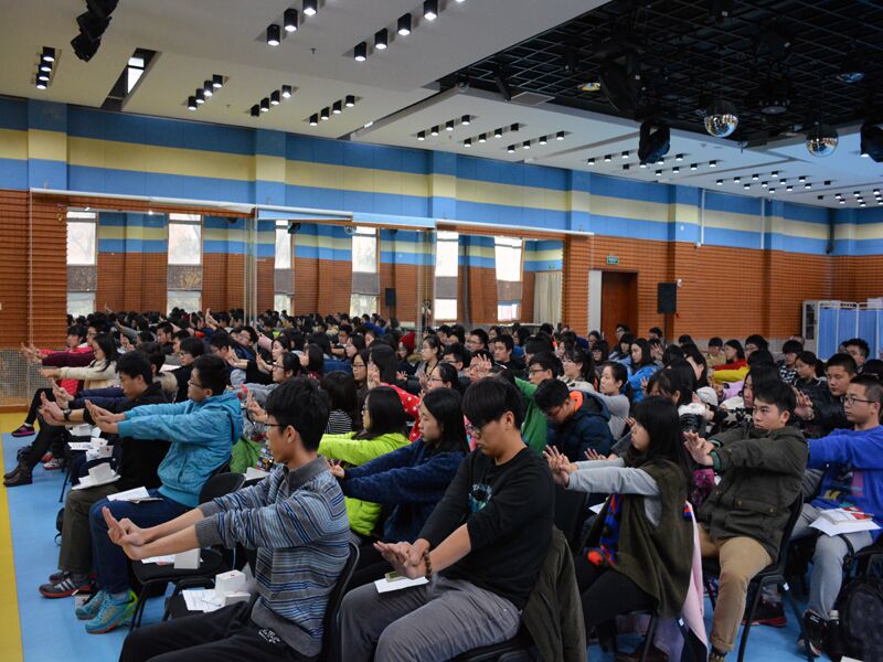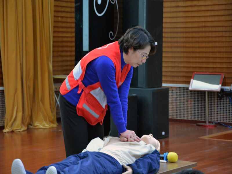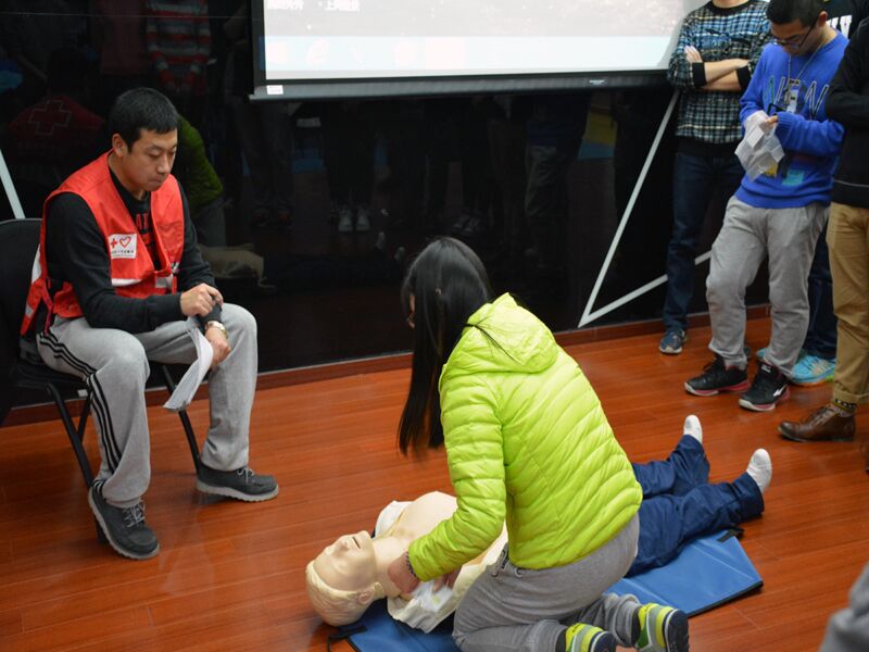 此次培訓包括急救的重要性、心肺復蘇、創傷救護三個主要內容。楊老師還特意帶來了急救知識書籍及假體教學道具,方便為同學們講解急救知識,示范急救方法。實踐操作環節,楊老師和7位急救教員手把手地指導同學們對人體模型進行心肺復蘇和人工呼吸。同學們也興致勃勃,積極認真地跟著老師一次次模擬練習。本次急救培訓共有99名同學參加,并且全部通過測試成為初級急救員。