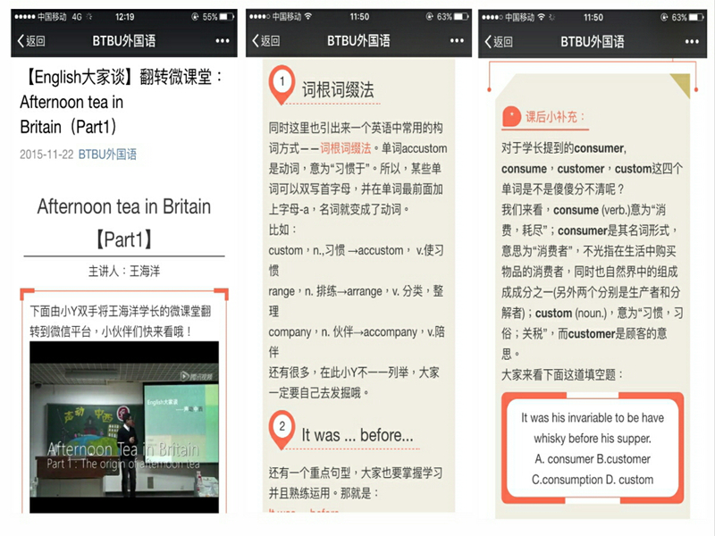 另外,學院以專業教師、外籍教師為指導教師,對精“英”小導師進行精心指導,進行微課專業設計。同時,組成“翻轉微課堂”團隊,對微課進行實時錄像,制作“翻轉微課堂”教學視頻,總結課堂知識要點,拓展語言文化內容,定期發布學院官方微信,保證線上線下不斷線,溫故知新,形成閉環學習效果。
