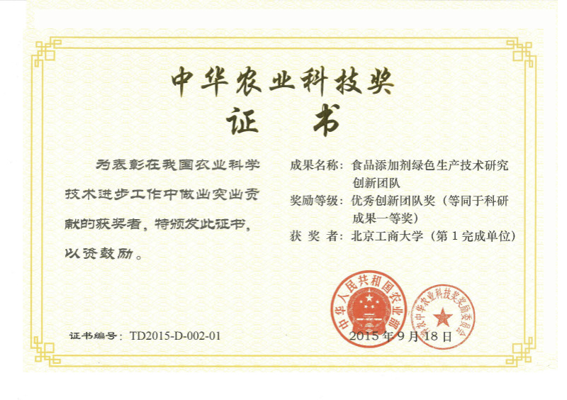 近日,由我校校長孫寶國帶領的“食品添加劑綠色生產技術研究創新團隊”榮獲農業部中華農業科技獎一等獎(等同于科研成果一等獎)。該獎項設立于2006年,經農業部同意、科技部批準,中國農學會設立,在促進農業科技發展、推動行業科技進步中起到激勵和導向作用,重點獎勵為我國農業科學技術進步和創新做出突出貢獻的集體和個人。我校獲獎的團隊成員有孫寶國、李秀婷、曹雁平、宋煥祿、徐寶財、王成濤、鄭福平、王靜、楊貞耐、張敏、田紅玉、謝建春、陳存社、劉玉平、陳海濤、韓富、辛秀蘭、廖永紅、黃明泉、王鳳寰等。